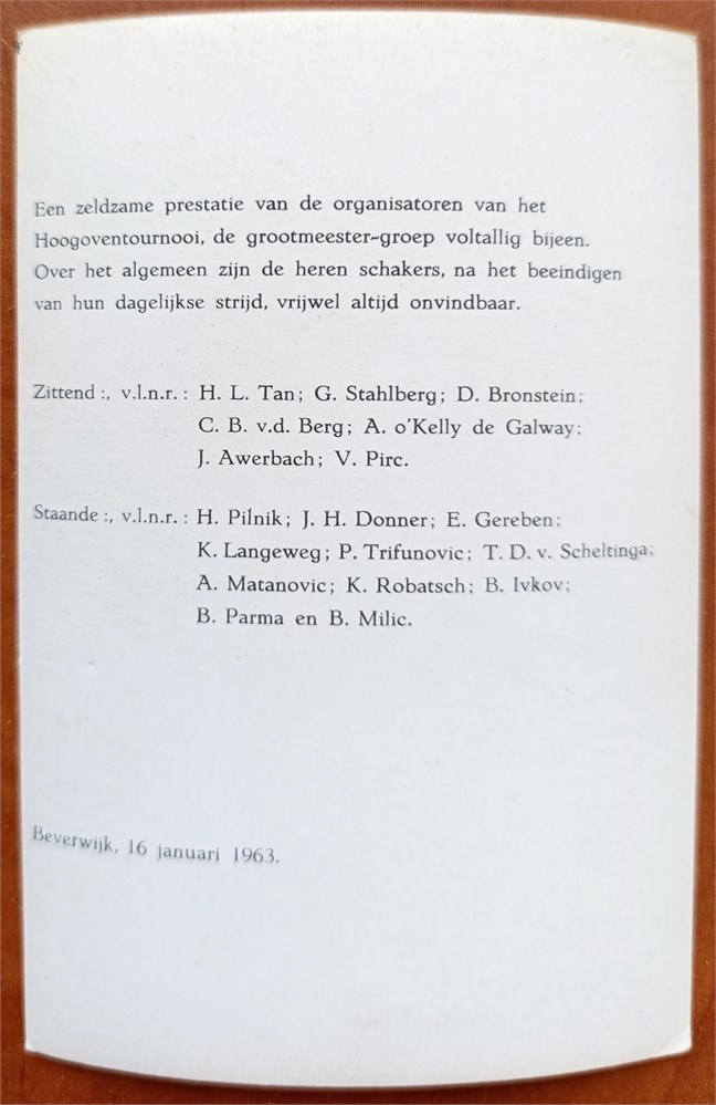 Original photo of the participants of the Hoogovens grandmaster tournament in Beverwijk in 1963. A part of the main sponsor's factory can be seen behind them. Size: 14.8 x 10.1 cm.