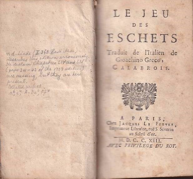 Greco, Gioachino. Le jeu des eschets, Traduit de l'Italien de Gioachino Greco, Calabrois. A Paris, Chez Jacques le Fabvre, Imprimeur Libraire, rue S. Severin au Soleil d'or. 1713. 10 leaves, 343pp. Brown marbled calfskin from 18th century with rich gilt on spine. Van der Linde I, 363; L/N 402; Schmid, pp. 184 ff.