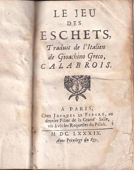 Greco, Gioachino. Le jeu des eschets, Traduit de l'Italien de Gioachino Greco, Calabrois. A Paris, Chez Jacques le Febvre, au dernier Pilier de la Grande'-Salle, vis a vis les Requestes du Palais. 1689. 12 leaves, 344 pp. Brown marbled calfskin from 18th century with rich gilt on spine. Van der Linde I, 363; L/N 400.