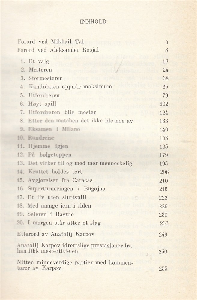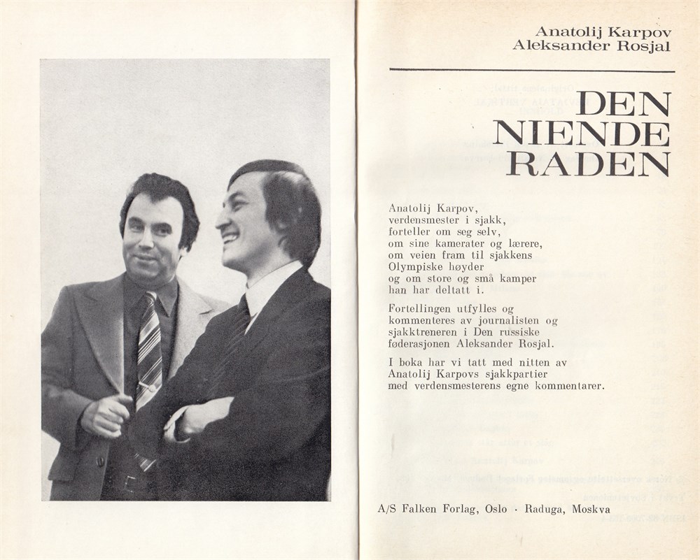 In Norwegian. Anatoly Karpov & Aleksander Roshal: Den Niende Raden (The Ninth Line).. Forewords by Mikhail Tal and Aleksandr Roshal.