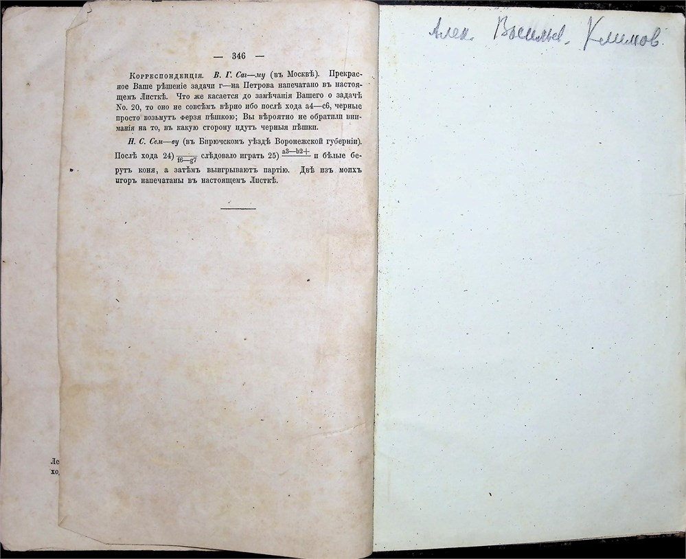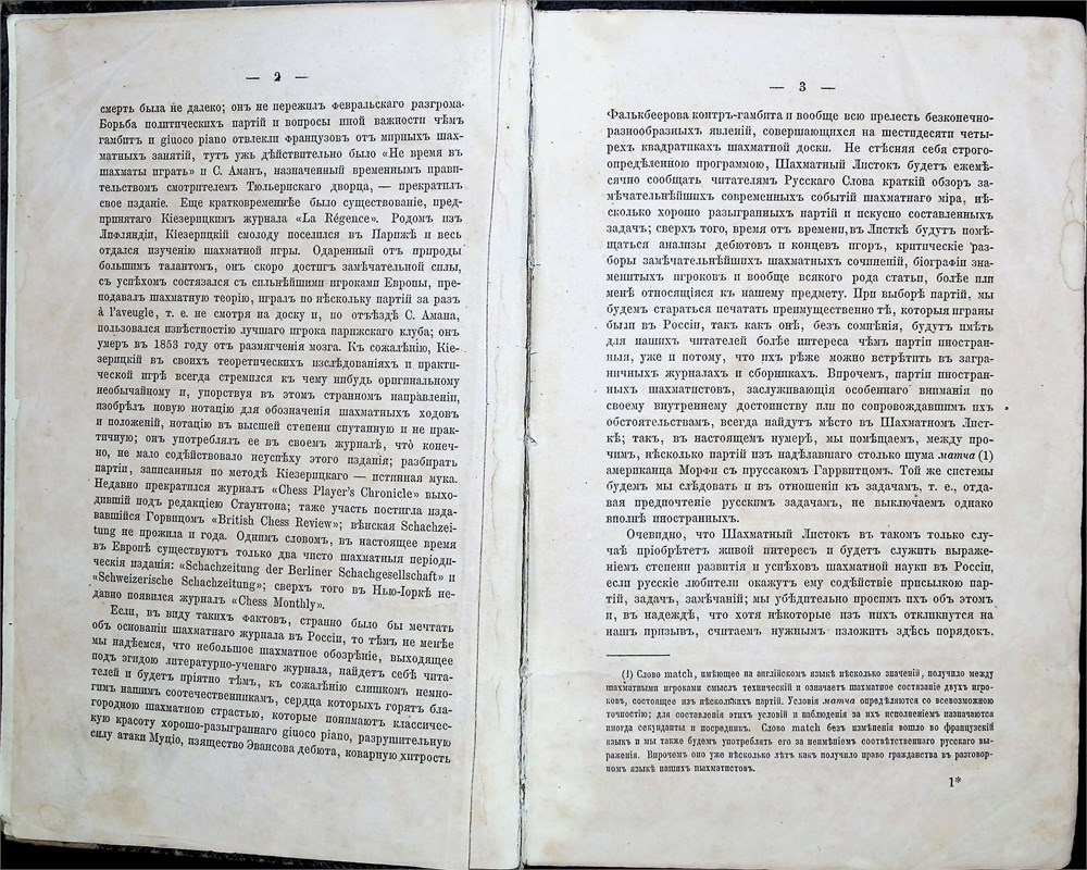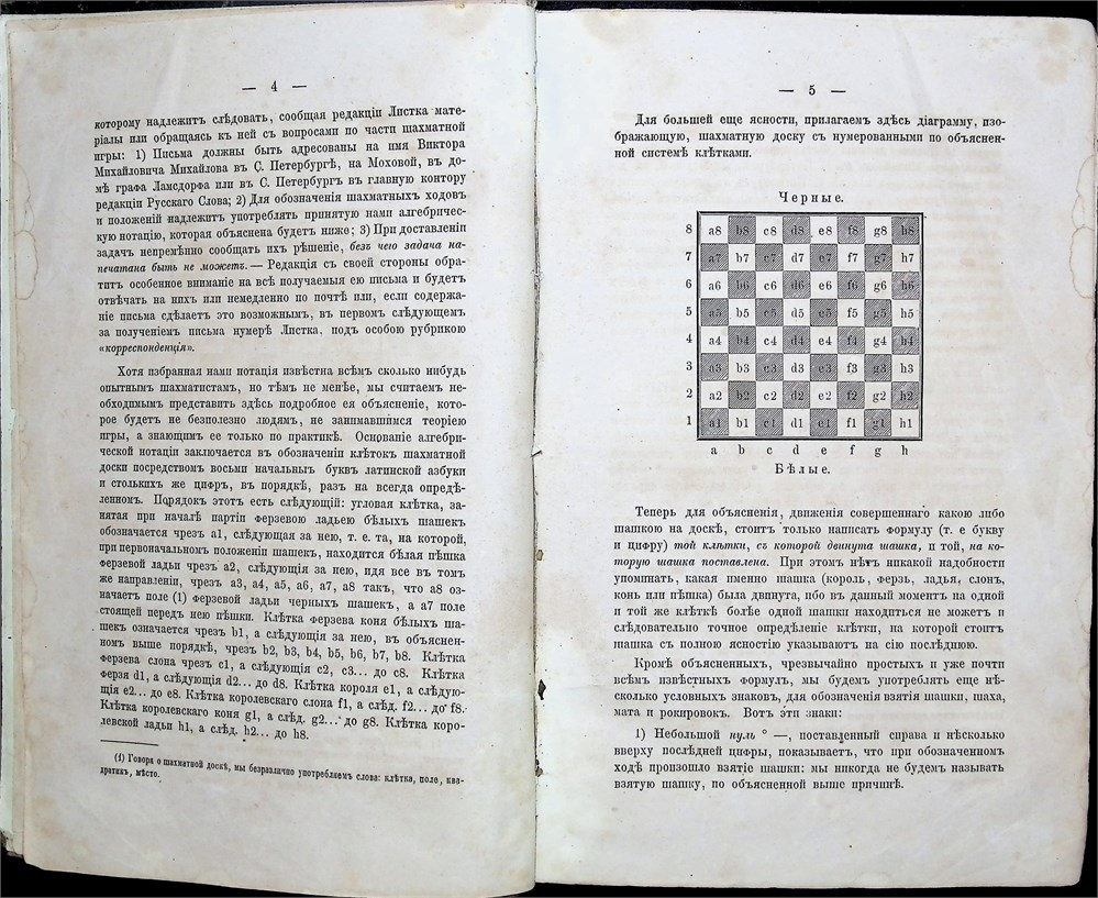 "Shakhmatnyy listok" originated as "a small chess review, published under the auspices of a literary and scholarly journal" (i.e., "Russkoye Slovo"). Initiating its publication, the editor informed readers that "without limiting ourselves to a strictly defined program, the Shakhmatnyy listok will monthly inform readers of Russkoe Slovo of a brief overview of the most remarkable contemporary events in the chess world, several well-played games, and skillfully composed problems; in addition, from time to time, the Sheet will feature analyses of openings and endgames, critical reviews of remarkable chess works, biographies of famous players, and generally all sorts of articles more or less related to our subject. When selecting games, we will strive to publish primarily those played in Russia, since they will undoubtedly be of more interest to our readers than foreign games, if only because they are less frequently encountered in foreign journals and collections." However, games by foreign chess players deserving special attention due to their inherent merit or the circumstances surrounding them will always find a place in the Chess Sheet... We will follow the same system in regard to problems, i.e., while giving preference to Russian problems, we will not, however, exclude completely foreign ones" (Shakhm. Sheet, 1859, no. 1, p. 3). The journal's main materials are the work of its editor. Also published were works by A. Petrov and I. Yanish, "Guide to the Study of Chess" by S. Urusov, and articles by other authors.