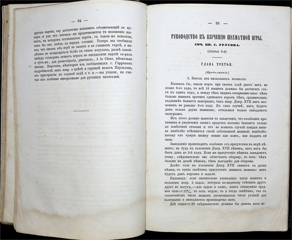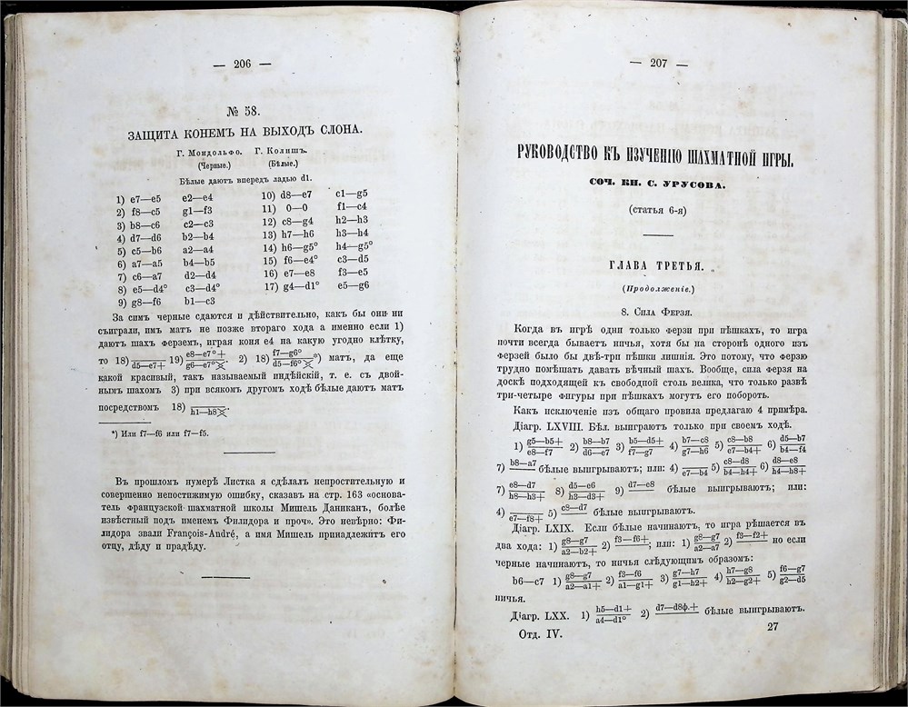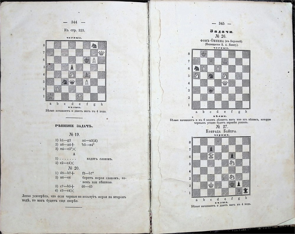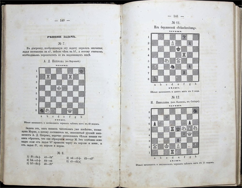 Published were games of St. Petersburg, Moscow, and out-of-town chess players, games of P. Morphy, A. Anderssen, I. Kolisch, and other foreign masters, numerous problems (including kipergani), correspondence on chess life in Russia and abroad, and chess-literary materials.