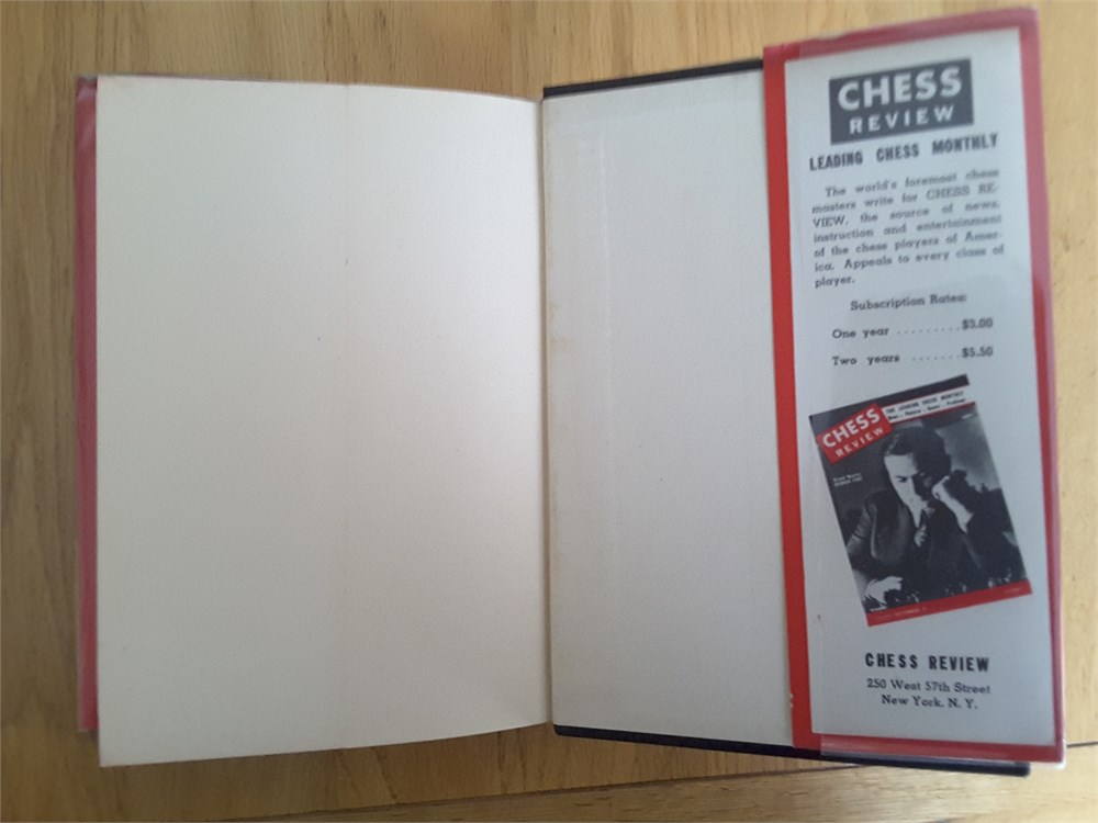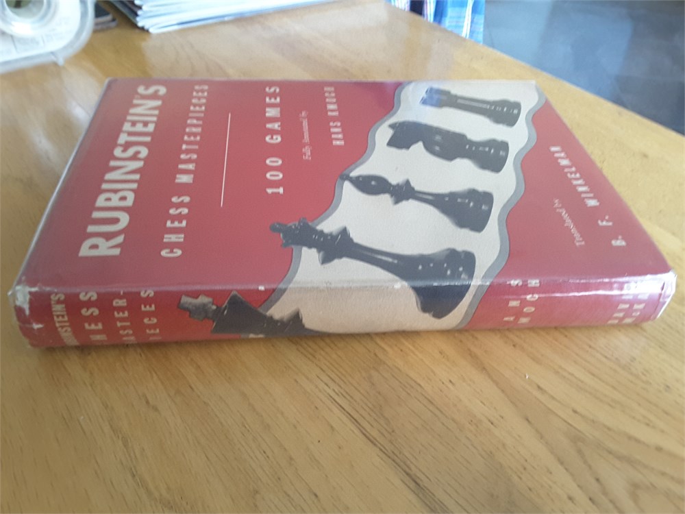 "Rubinstein's Chess Masterpieces" by Hans Kmoch. Published in hardback by David McKay in 1941. First Edition. 192pp. Betts 29-126. The book is in near Very Good condition for its age. The binding is tight and there is no shelf lean or bowing present. The top edge block has dust discolouration but the other two are clean. The boards are clean. The gilt lettering on the spine has faded but is still readable. The gilt lettering on the front board is still strong. Internally there is a name and short note (dated 1942) in pen on the front endpaper. Aside from this, the book appears to be inscription, annotation and foxing free. The pages have very light age-tanning but this is to be expected in a book published during WW2. The dustjacket is in Good Plus condition for its age. It has very small areas of loss to the head and tail of the spine (see scans) plus a closed tear on the rear panel. There is also a very small area of loss to the rear panel, up in the top left hand corner. The top edge of the front panel has mild crinkling. The spine area is lightly age-tanned. The dustjacket is now protected by a removable see-through sleeve. Book Condition: 7.5/10. Dustjacket Condition: 7/10. Games are given in English descriptive notation. Further scanned images are available on request. A nice copy of a sought after chess book. Postage extra, from either the Republic of Ireland (via 'An Post') or from Northern Ireland (via 'Royal Mail'). Any questions, please just ask.