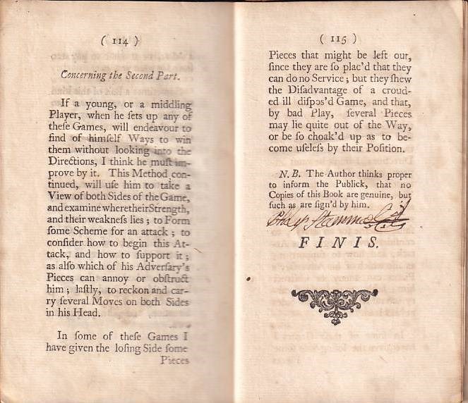 The Noble Game of Chess; or, a new and easy method to learn to play well in a short time: together with a curious account of its antiquity, derivation of its terms. By Philip Stamma, native of Aleppo in Syria; and interpreter of the Oriental languages to his majesty the king of Great-Britain. London: Printed for J. Brindley, Bookseller to his Royal Highness the Prince of Wales, in New Bond-street. 1745. XXIV, 74pages. + The Second Part: consisting of a hundred games, in various and particular situations, with the manner of playing them. 1 leaf, 115 pages. Fold-out diagram after p.XX. L/N 427. Kieler Schachkatalog 1178.