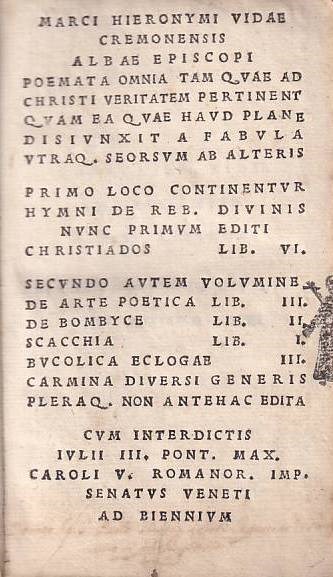 Vida, Marcus Hieronymus. Poemata omnia tam quae ad Christi veritatem pertinent ... Primo loco continentur Hymni de Reb. divinis nunc primum editi Christiados Lib. VI. Second autem volume de arte poetica Lib. III. De Bombyce Lib. II. Scacchia Lib I. Bucolica eclogae III. Carmina diversi ... Cremona, Mutius and Locheta, 1550. 216 leaves, 76 leaves. Parchment. L/N 4558. Kieler Schachkatalog 8139. Brunet V, 1181.