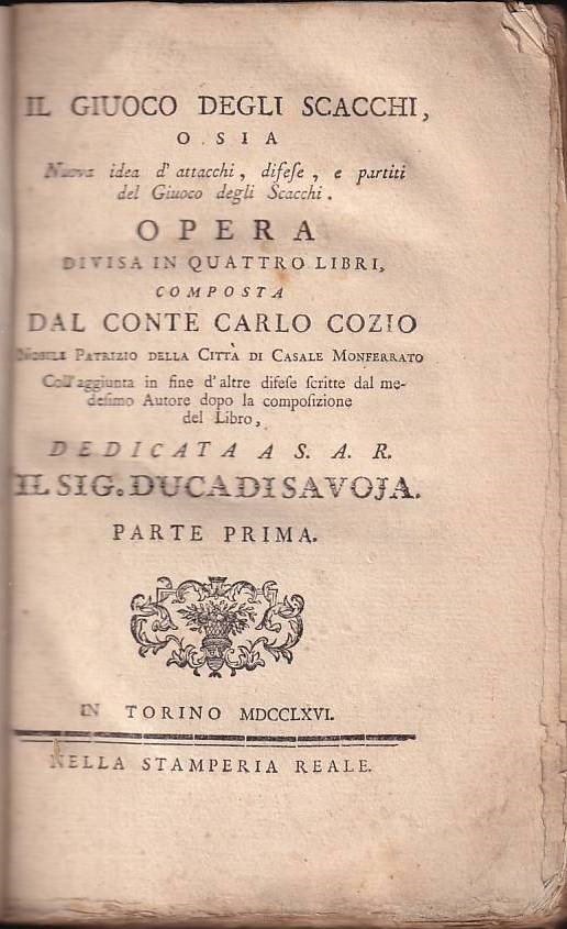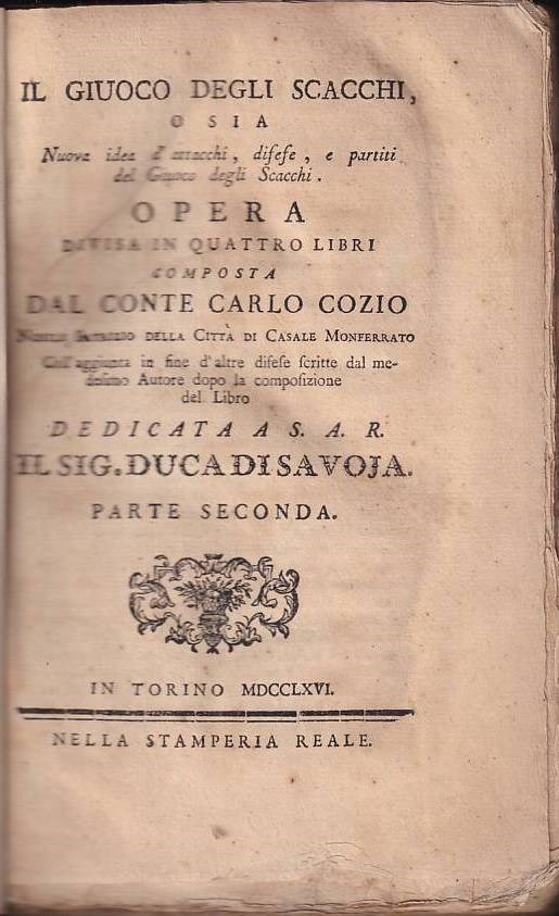 Cozio, Carlo. Il giuoco degli scacchi, o sia nuova idea d'attacchi, difese, e partiti del Giuoco degli Scacchi. Opera divisa in quattro libri ... Coll'aggiunta in sine d'altre difese scritte dal medesimo Autore dopo la composizione del Libro ... 2 volumes. Turin, Stamperia Reale, 1766. 4 leaves, 357 pages, 2 leaves (Indice), 1 leaf (blank) + Parte Seconda: 382 pages, 2 leaves (Indice), 1 leaf (blank) New red cloth with gilded spine L/N 525. van der Linde II, 412 f. Chicco / Sanvito, Lineamenti ..., 255. Chicco/Porreca, p. 164; Schmid, pp. 152 f. "The author has... from the beginning to the end of his work presented only practical games without annotations. Cozio treats the King's Gambit in particular detail, incorporating all games of this type from the Calabresian; but he has also included some unique innovations not found elsewhere. Cozio has also followed Greco in that he... only uses restricted castling... The number of endgames he has played exceeds 200... Moreover, much in the work is highly commendable, and there are, especially in the openings, some extremely important moves, which, however, usually lead to very unimportant games..." (cf. Bilguer quoted in Schmid). Thus, praise and criticism are evenly balanced in the literature. The Italian Count Carlo Cozio (c. 1715 – c. 1780) was also active as a chess writer and player. Rare edition, as many copies were destroyed in a fire at the Stamperia Reale.