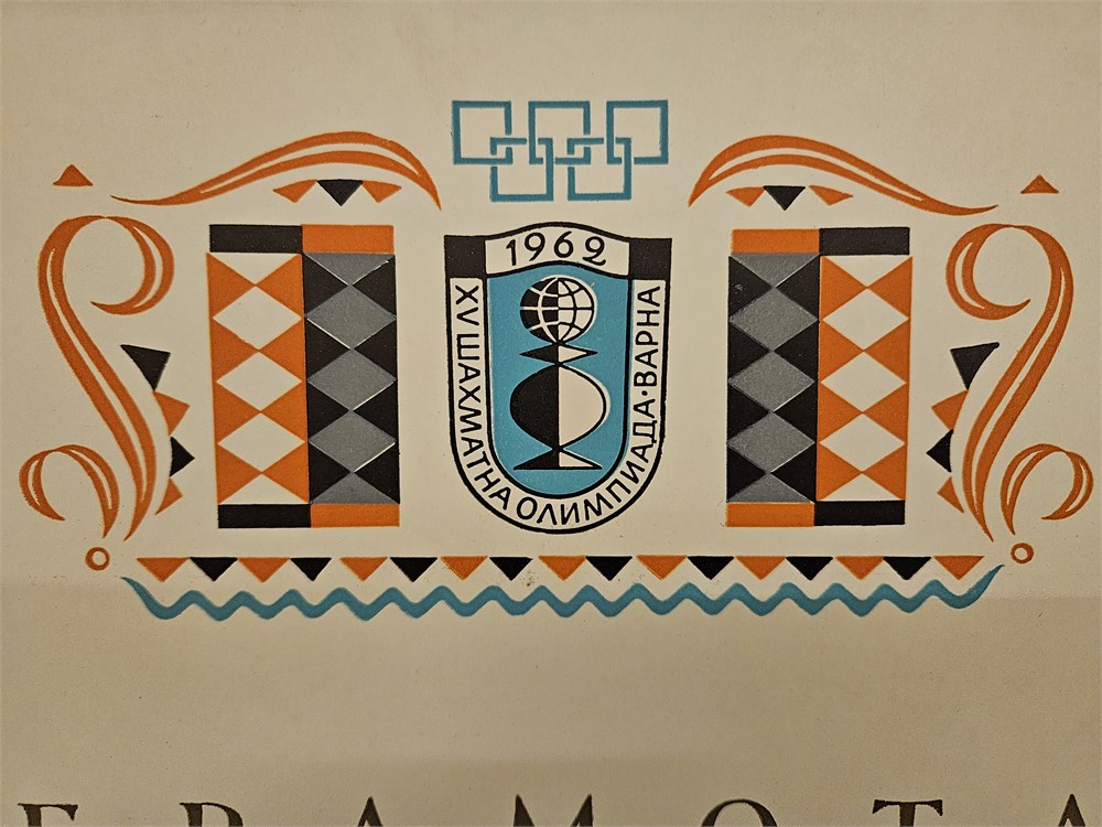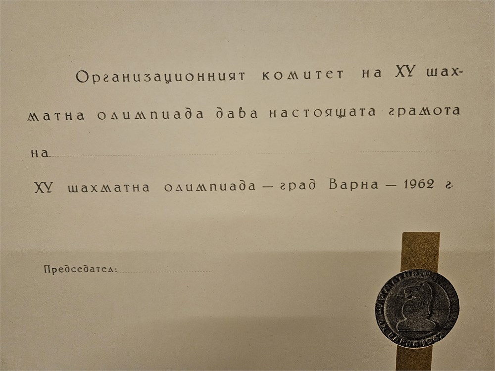 Original certificate of the XVth Chess Olympiad Varna 1962. Tekst: The organising Ccommittee of the XVth Chess olympiade gives this diploma to ...