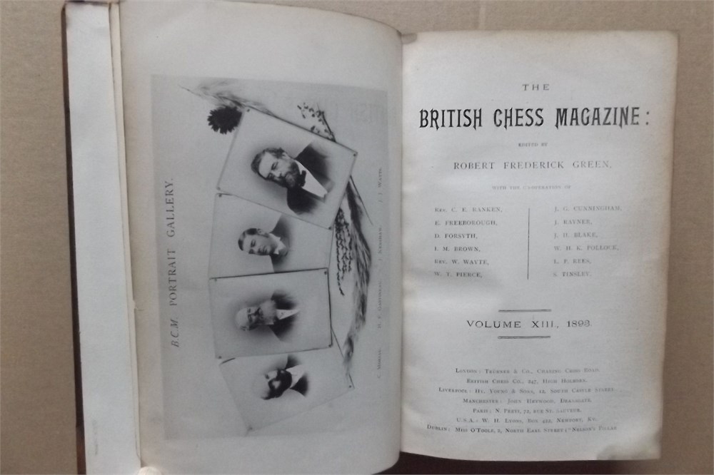 British Chess Magazine 1893 Vol.13. Half leather, rebacked with the original spine which has a split down the top part, internally good. WITH: The 72 page Christmas Number. With a bookplate of the ECF collection. I believe this was the only year that BCM issued a special Christmas number and it is very scarce.