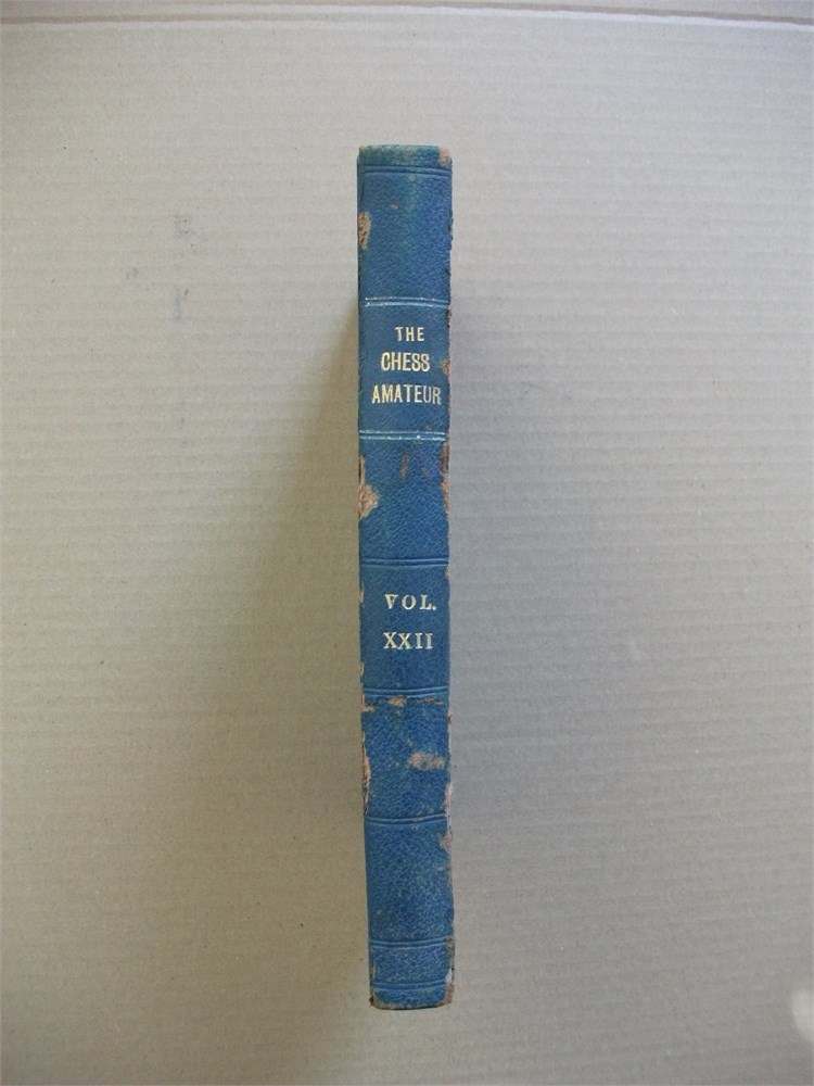 CHESS AMATEUR. Monthly Chess Magazine. Vol.22. Oct.1927 – Sep.1928. Blue half leather, top joint split with some loss of leather, with elaborate gilt stamp of Baruch H. Wood on front cover. 396pp. Without index. Includes games department edited by W.A.Fairhurst (from Dec issue), endgame section by T.R.Dawson, problem section by C.S.Kipping, Fairy chess by Dawson, literary section edited by Dawson. These late volumes are very scarce.