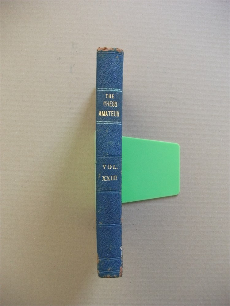 CHESS AMATEUR. Monthly Chess Magazine. Vol.23. Oct.1928 – Sep.1929. Blue half leather, top joint split at foot with small loss of leather, with elaborate gilt stamp of Baruch H. Wood on front cover. 288pp. Without index. Includes games department edited by W.A.Fairhurst, problem section by C.S.Kipping, Fairy chess by Dawson. These late volumes are very scarce.