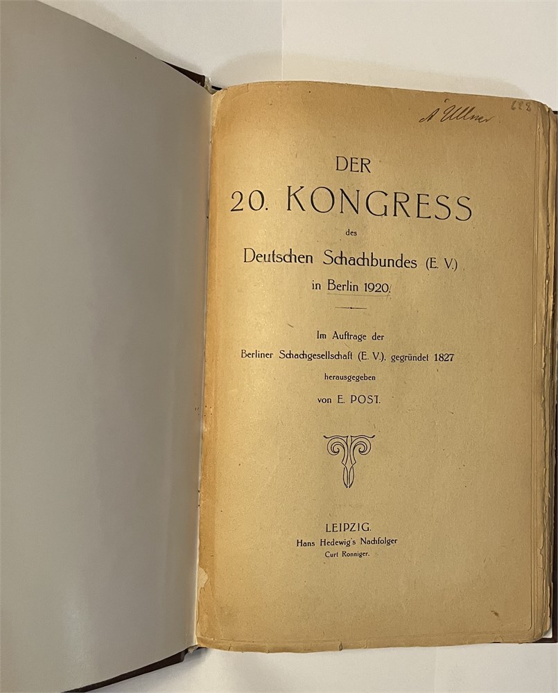 1920 Berlin Post, E(Herausgegeben) Der 20. Kongress des Deutschen Schachbundes (E. V.) in Berlin 1920. 156+(4)p. L/N 5335 Curt Ronniger Leipzig (s.a.) b. Rebound. VG 30,00 €