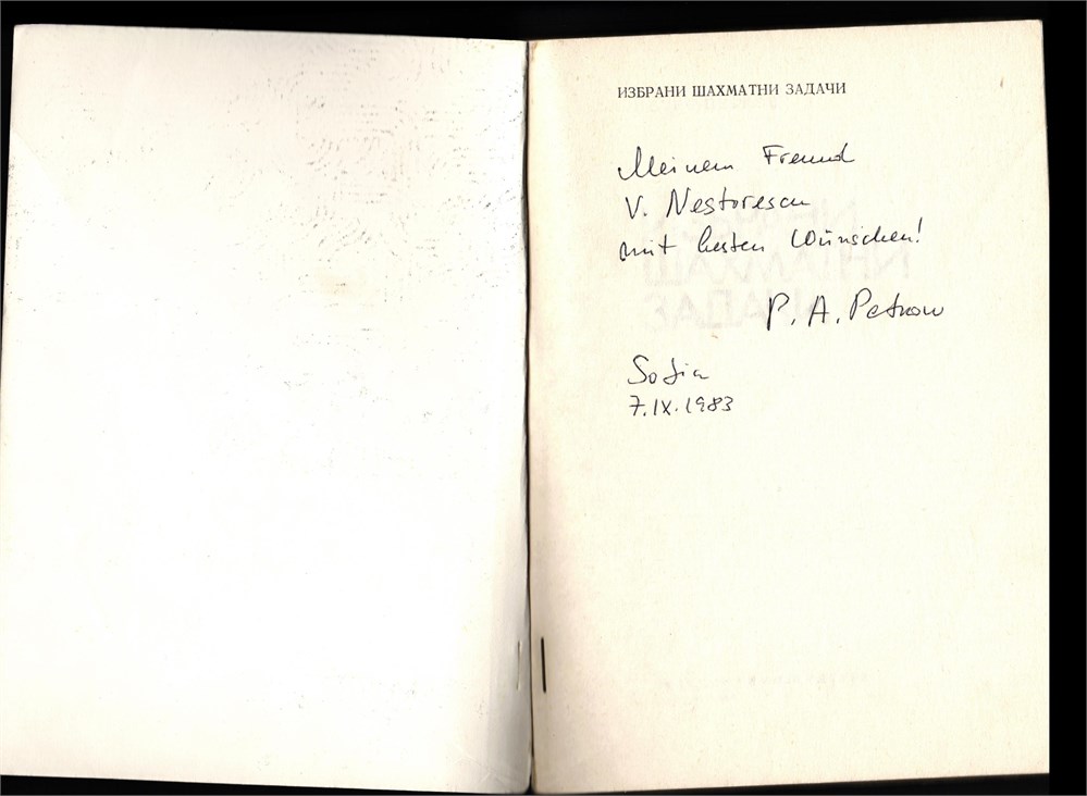 With a hand-written dedication from P. Petkov for V. Nestorescu, Romanian GM-Comp., dated "Sofia, 7.ix.1983".