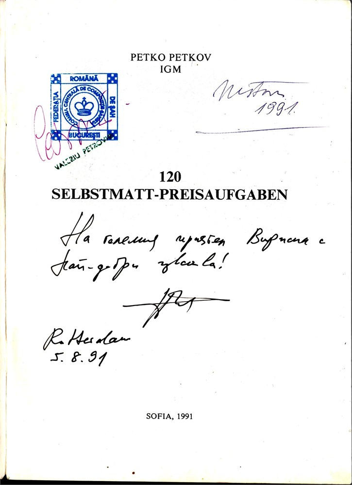 On title page there is a dedication and signature of Petko Petkov for Romanian GM-Comp Virgil Nestorescu, dated "Rotterdam, 5.8.91"; signed by Virgil Nestorescu, "1991"; stamp and signature of Valeriu Petrovici, well known Romanian composer.