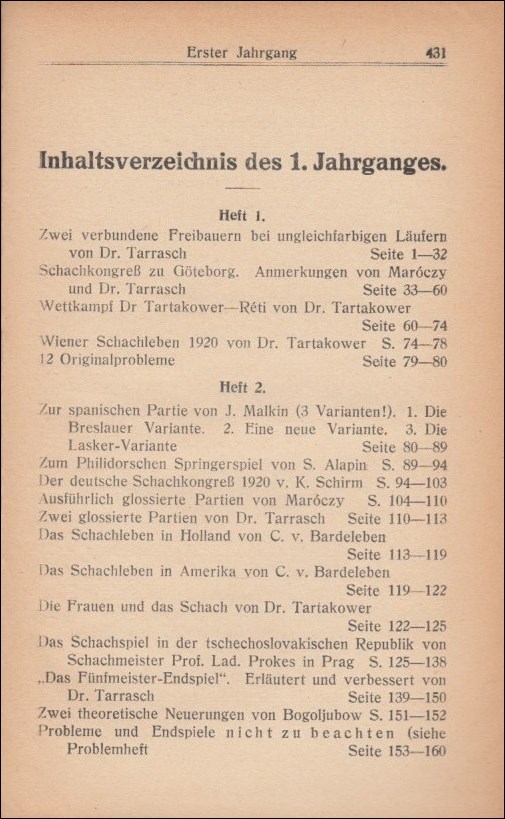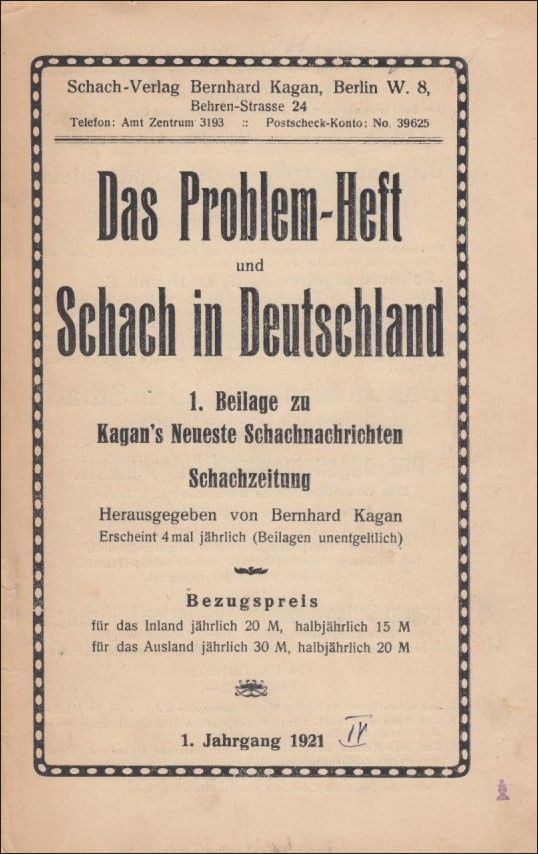 Kagans Neueste Schachnachrichten 1921. Vol 1. No. 1-4 printed in 5 issues. Heft1 [1-80], Heft2 [81-160], Heft3 [161-296], Das Problemheft [297-352], Heft4 [353-432]. Algebraic notation. Many diagrams. A few photos in text. 432 pages. Index, 2 pages was published on pp. 431-32. No title page. Heft 3 is the tournament book from the "Ersten Internationales Meisterturnier des Schachverlages Kagan in Berlin" with a group photo between pages 160-161 (missing). Bernhard Kagan, Berlin. L/N 6073. Kieler Schachkatalog 142. Felice 1236.