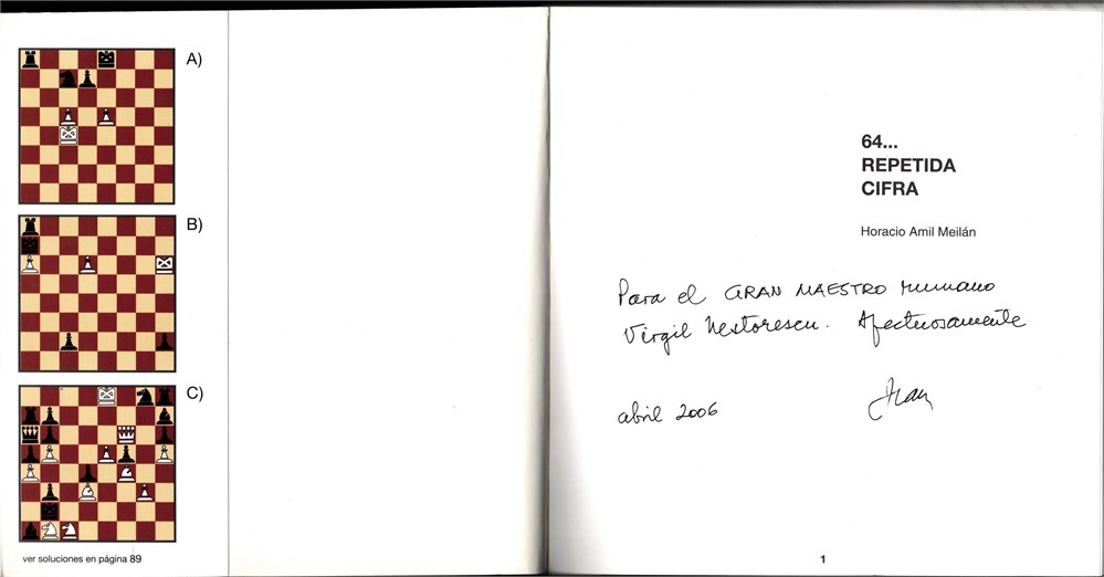 Condition: good. It would have been very good, but the left side of the first cover is water spotted (see image). With the hand-written dedication and signature of the author for the well-known Romanian GM-Comp. Virgil Nestorescu, dated "abril 2006".