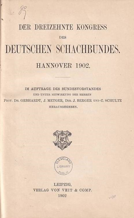 Hannover 1902. Der dreizehnte Kongress des Deutschen Schachbundes. The thirteenth congress of the German Chess Federation. Congress report and regulations. Cross tables. Progress table. Game index. Opening survey and index. 152 of 153 games from the congress tournament without annotations. Many diagrams. Round-by-round reports. Janowski won in front of Pillsbury. 134 games from the minor tournaments. All 21 games from Pillbury's blind simul. Report and problems from the German Chess Fedration's VIII Problem tournament including the solutions. XLVIII, 204 pages. 20 cm. Leipzig, Veit, 1902. L/N 5259.