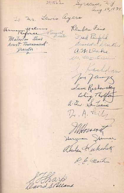 The 26 games, fully annotated, with brief accounts of the players' careers, and tables of their tournament and match records. Signed by by Rueben Fine, fred Reinfeld, Arnold Denker, A.W. Dake, I. Kashdan, Samuel Reshevsky, E. Tholfsen, A. Santasiere, Dr. Seitz, Horowitz, H. Steiner, A. Kupchik, Herman Helms and others.