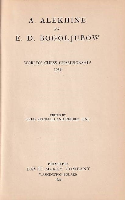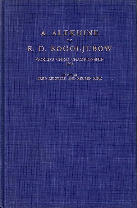Alekhine - Bogoljubow. Reinfeld, Fred and Reuben Fine. (Ed.) A. Alekhine vs. E. D. Bogoljubow. World's chess championship 1934. With diagrams. 56 pages. Descriptive notation. Philadelphia, McKay, 1934. Original blue cloth with gilted title on front cover. L/N 5096; Betts 27 - 35.