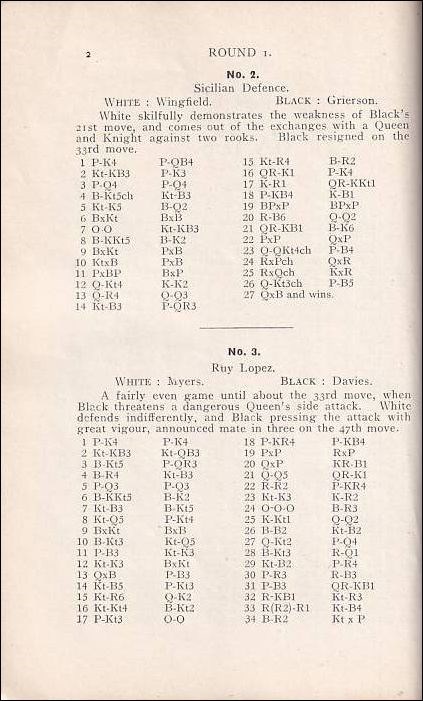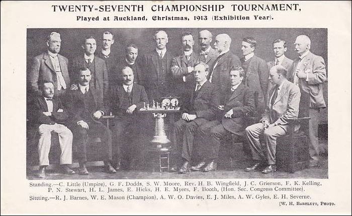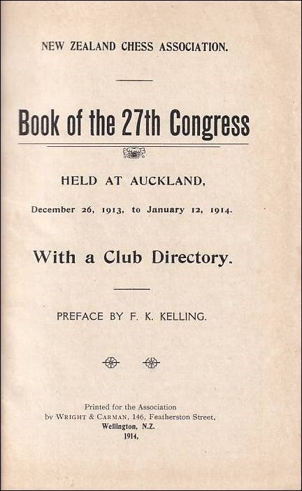 Auckland 1913 - 1914. Book of the 27th Congress, held at Auckland, December 26, 1913 - January 12, 1914. All 105 games from the tournament, without annotations. Descriptive notation. No diagrams. One plate with a group photo. Preface by F. K. Kelling. Games index. Opening index. Cross table. Progressive score table. With a Club Directory. W. E. Mason won in front of Barnes, Davies und Gyles. XVI, 73 pages. Paperback, with thin paper covers. Stapled. New Zealand Chess Association, Wellington, Wright & Carman 1914. Betts 25 - 53.