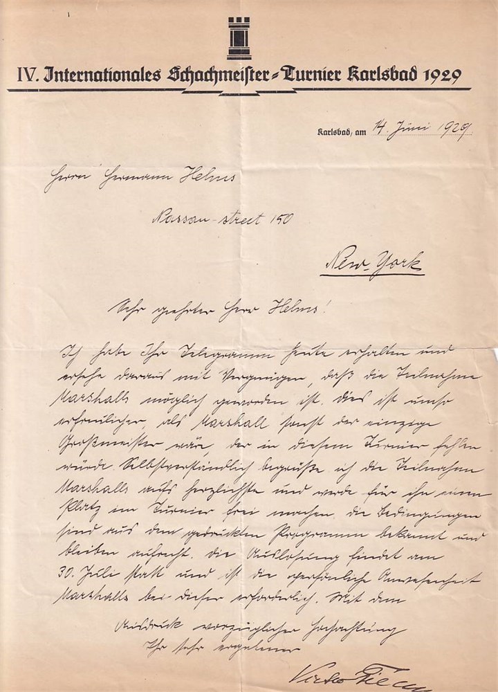 Karlsbad 1929, Tournament program. 4 pages, folded. 30 cm * 23 cm. A handwritten letter from Victor Tietz (the organizer and chairman for the Karlsbader Schachklub) to Herman Helms, is laid in.