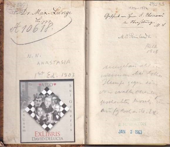 Condition: Contemporaty binding. Inside slightly yellowed. Some foxing on title page.Fron cover loose. Spine missing. Max Lange’s copy, signed, with writing by him on opposite page. Rare edition. From David DeLucia's Chess Library.