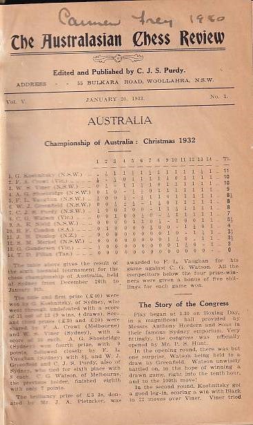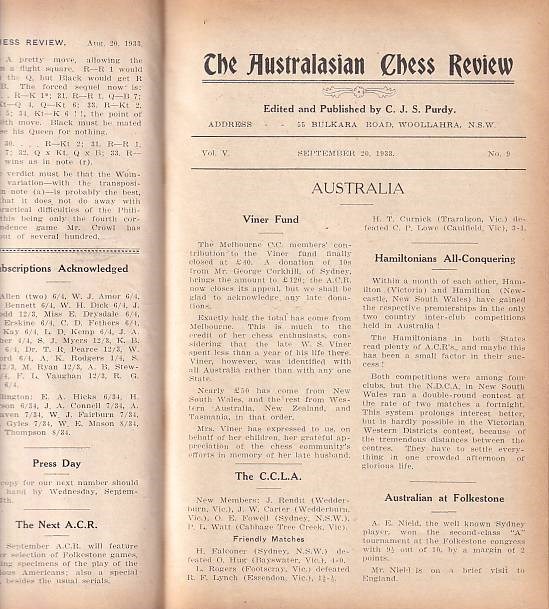 The Australasian Chess Review 1933 vol 5. Edited by C. J. S. Purdy. Woollahra, Purdy, 1933. With many diagrams. 344 pages. Index. New cloth binding with gilt title on spine. L/N. 6382; Betts 7 - 70.