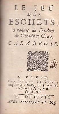 Greco, Gioachino. Le jeu des eschets, Traduit de l'Italien de Gioachino Greco, Calabrois. A Paris, Chez Jacques Le Febvre Imprimeur Libraire, rue S. Severin, à la Pomwme d'Or, & au Soleil d'or. 1707. With title vignette and a few ornamental elements in text. 1 white, title page, 13 leaves, 343 pages, 1 white leaf. Brown marbled calfskin from 18th century with rich gilt on spine. Van der Linde I, 363; L/N 401; Schmid, pp. 184 ff.