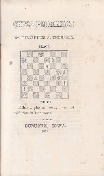 Chess Problems: Either to Play and Mate, or Compel Self-Mate in Four Moves (Dubuque, Iowa, 1873) is a collection of original chess puzzles by Theophilus A. Thompson. Published by the Dubuque Chess Journal, it presents elegant mate-in-four and self-mate problems that showcase Thompson’s creativity and deep understanding of chess composition—making it one of the earliest known chess books by an African-American author. Original Pamphlet. 61 pages. L/N 2425.