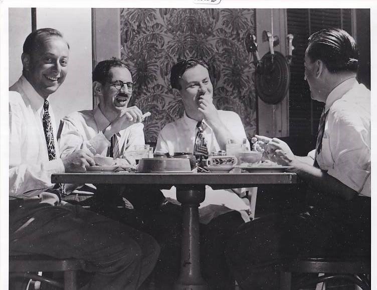 Superb 8”x10” photo of Arnold Denker enjoying a meal with Isaac Kashdan, Reuben Fine and I.A. Horowitz. Meals were served to the team, officials and operating staff in the Hotel dining room adjoining the player's room. Taken by famous photographer, Ruth Orkin.