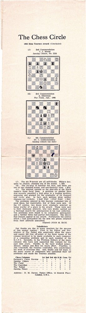 The Chess Circle - Reprinted from The Tablet, September 2nd, 9th and 16th [1966], printed on one side in 2 parts, one size 21x34 cm and another size 9x34 cm.