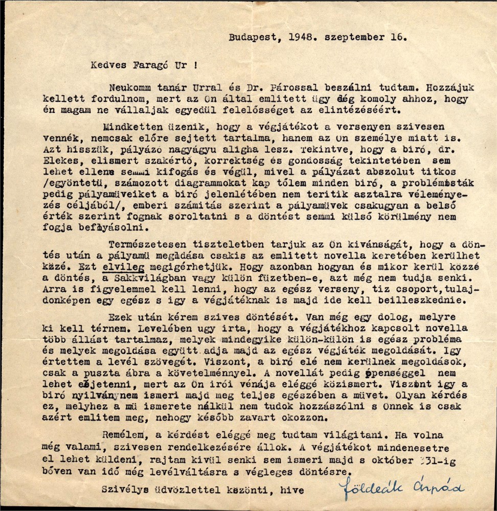 Letter to P. Farago, 1 pag., in Hungarian, type-written, original signed.