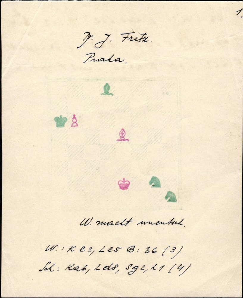 FRITZ J., Praha - Original hand-written study, diagram not stamped!, solution on opposite side, small size 8,5x10,5 cm.
