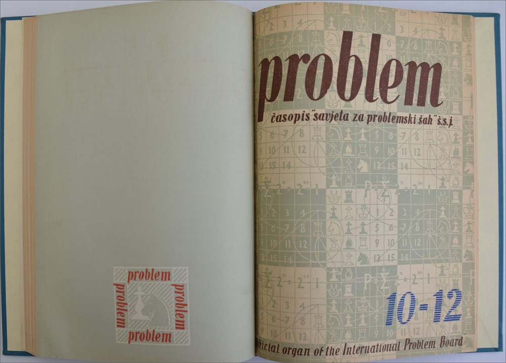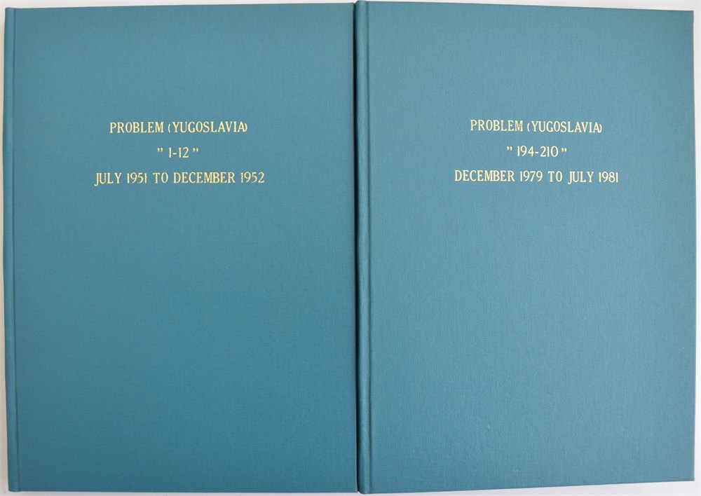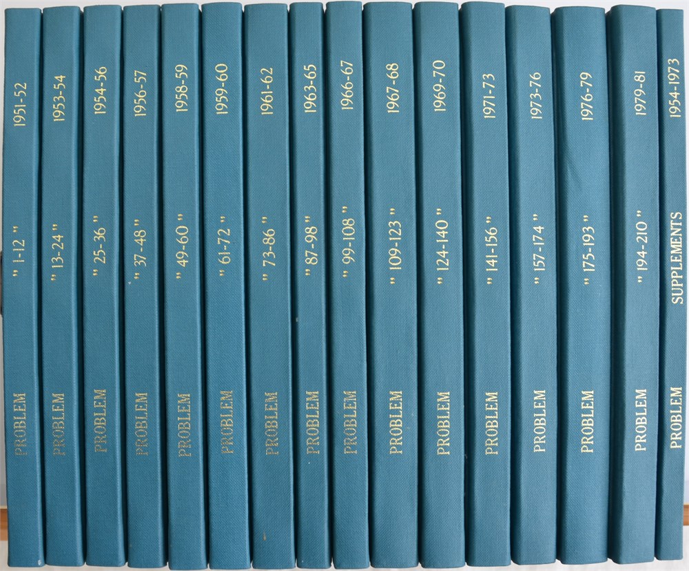 Uniformly bound complete run of Problem, the Yugoslavian/Croation periodical from issue 1-2 in July 1951 to issue 206-210 in July 1981, in 15 volumes. Betts 42-15, Di Felice's Chess Periodicals 1873 (1872 and 1873 are the same periodical), Kieler 6057.
