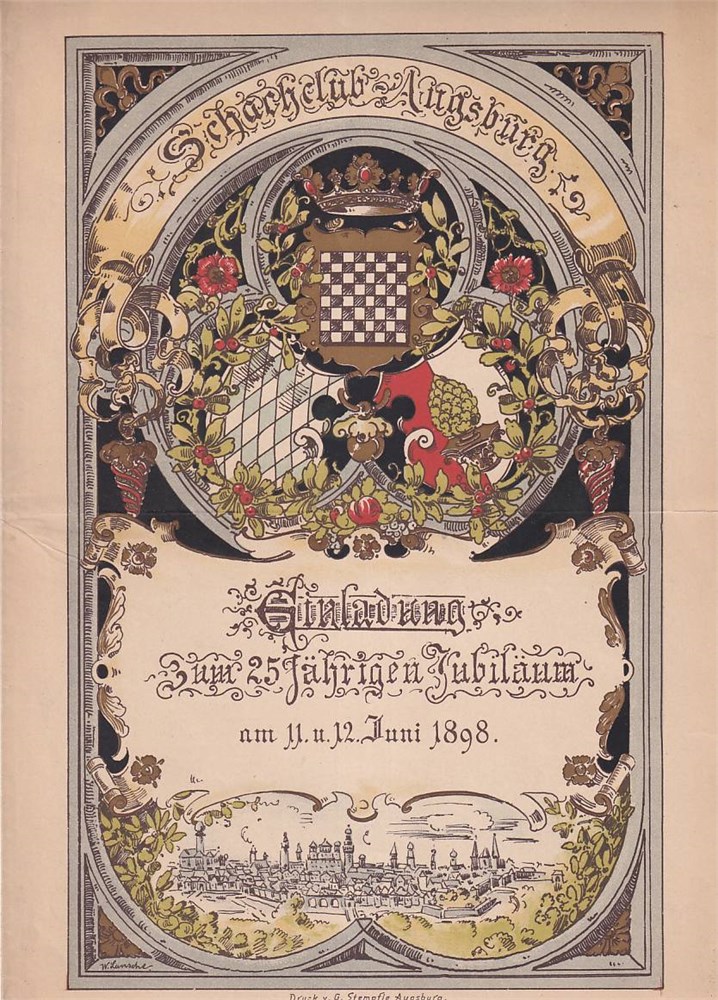 Attractive program, Schachclub Augsburg. Einladung zum 25 jahrigen Jubilaum. June 12, 1898. 8 pages with invitation for the celebrations and the progamme. 5 pages are blank. 34 cm.