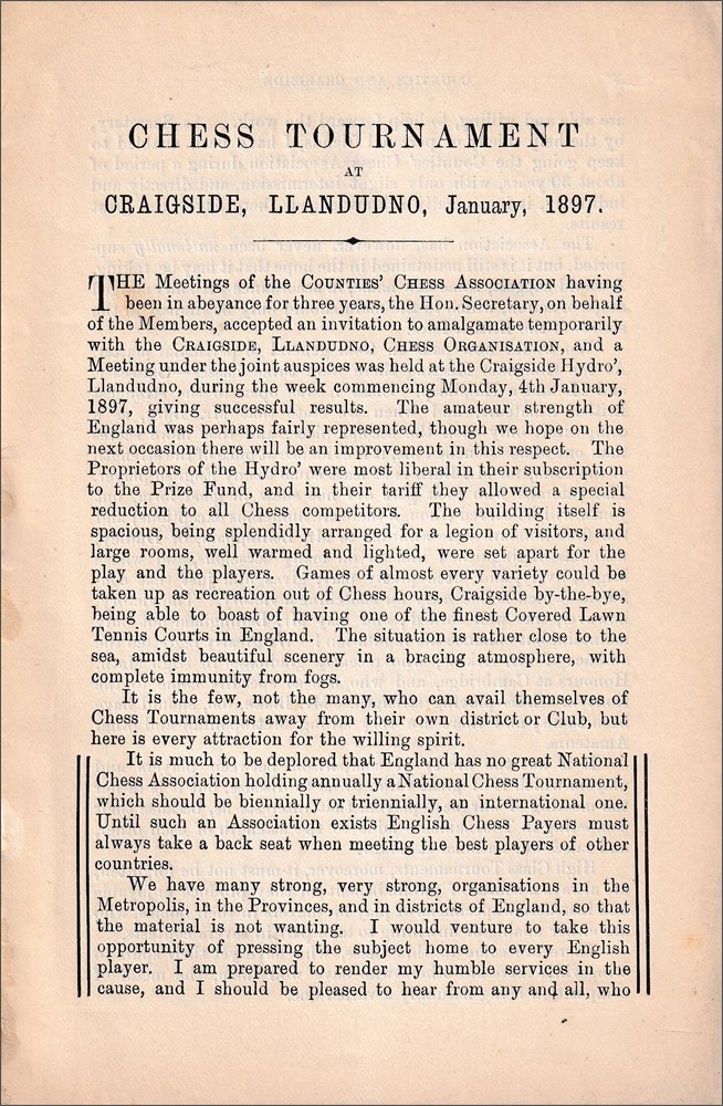 Llandudno 1897. The Counties and Craigside chess tournament. A report and 13 selected games with notes, including 1 brilliancy prize game annotated by Tarrasch. Descriptive notation. 1 diagram. Cross table. Burn won in front of Gunston and Bellingham. 26 pages. 18 cm. Pamphlet with paper cover. Stapled. James Williamson, Lincoln 1897. L/N 5247. Betts 25 - 34.