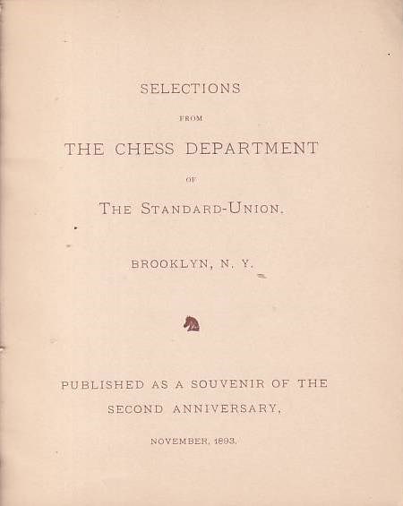 Broughton, L.D. Souvenir of Second Anniversary. Chess Department of the Standard-Union. Brooklyn, 1893. Selections from the Chess Department of the Standard-Union. Brooklyn, N.Y. Published as a souvenir of the second anniversary. November, 1893. 47pp. Rare. Not in Cleveland or L/N.