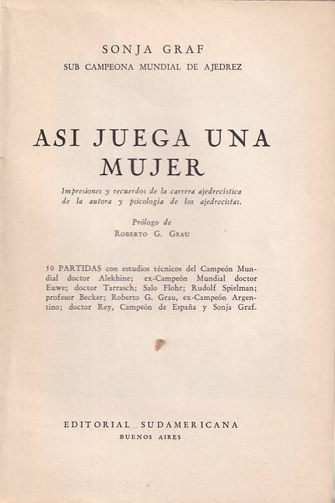 Graf, Sonja. Asi juega una mujer. Impresiones y recuerdos de la carrera ajedrecistica de la autora y psicologia de los ajedrecistas. Prólogo de Roberto G. Grau. 50 partidas. Impressions and memories of the author's chess career and the psychology of chess players. Foreword by Roberto G. Grau. 50 games. Buenos Aires, Editorial Sudamericana, (1941). With many diagrams. 300 pages, 4 leaves. Paperback. L/N 3070.