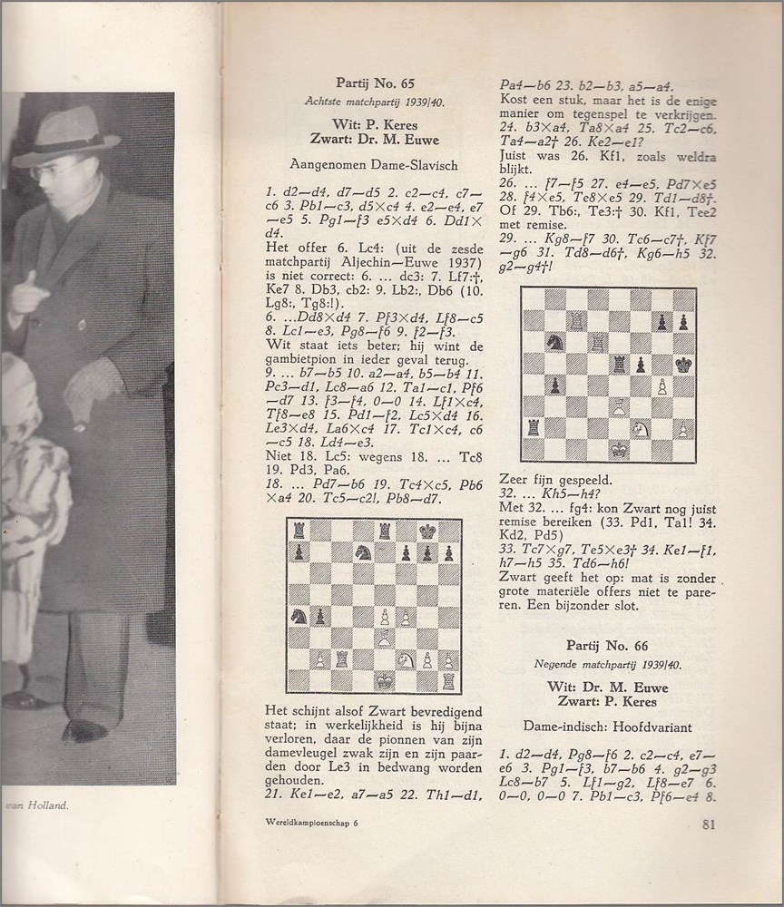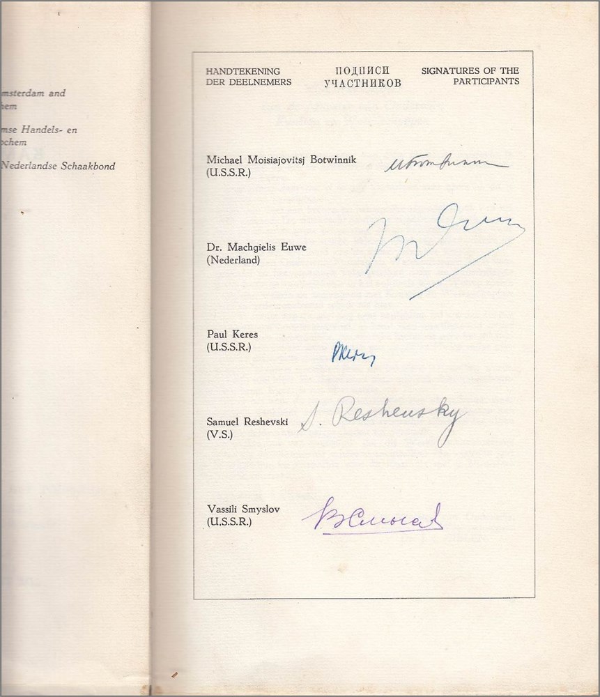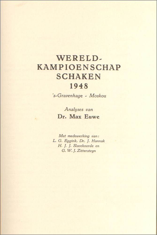 The Hague / Moscow 1948. Den Haag / Moskau 1948. Wereldkampioenschap schaken 1948. 's-Gravenhage - Moskou. With an introductory history on the tournament by Hannak. Twelfe photos on 6 plates printed recto and verso. All 50 games from the tournament with detailed annotations in Dutch. Algebraic notation. Many diagrams. Cross tables. Opening index. Game index. Table of content. Botvinnik won in front of Smyslov. Original black or light cloth with title printed on the front cover. Dust jacket. One leaf, signed by all the participants was inserted into the limited edition (white dust jacket). 25,5 cm. 252 pages, fly leaf. Lochem, De Tijdstroom, ca. 1948. L/N 5732. Kieler Schachkatalog 3637.