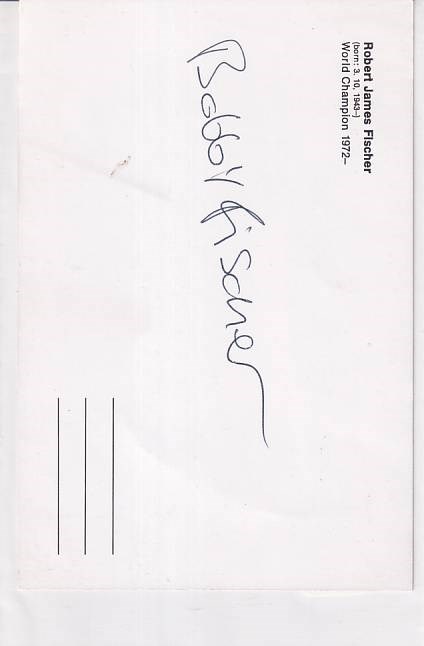 FISCHER. Picture postcard of Bobby Fischer seated at the chessboard. Boldly signed on back by Fischer.