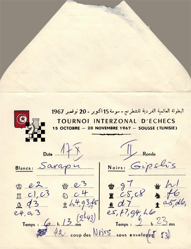 Soussa, 1967 IZT. Envelope for the adjourned game Sarapu - Gipslis, 17.x.1967, 2nd round. Original written.