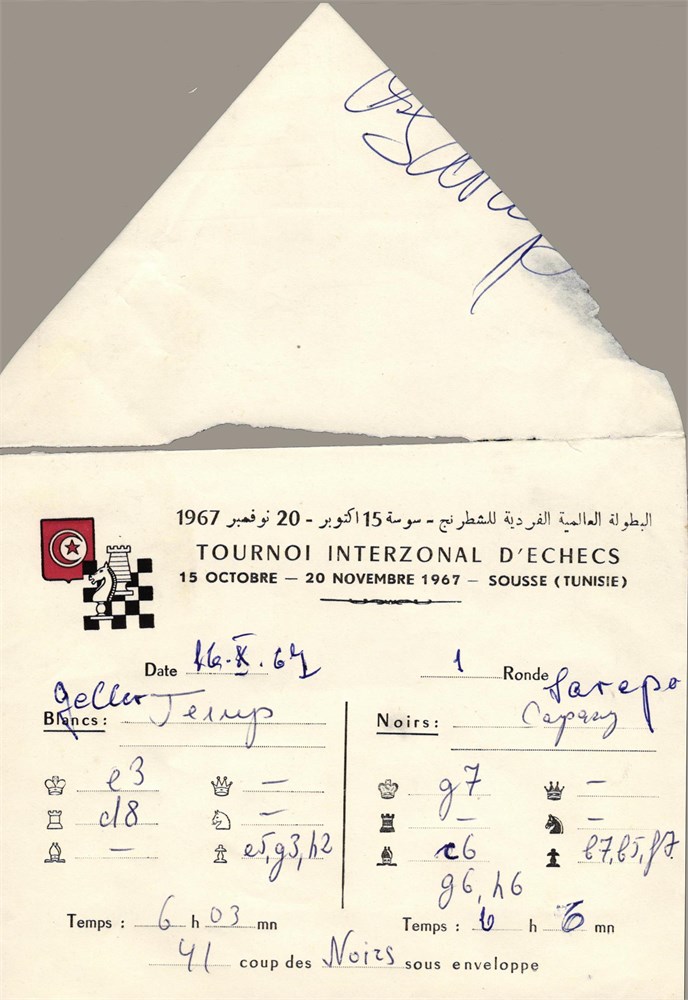 Soussa, 1967 IZT. Envelope for the adjourned game Geller - Sarapu, 16.x.1967, 1st round. Original written (by Geller !?) and signed on back by Sarapu!