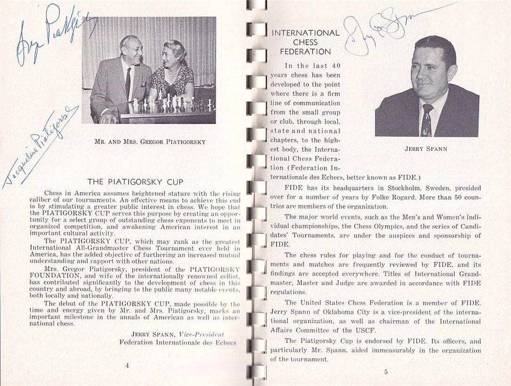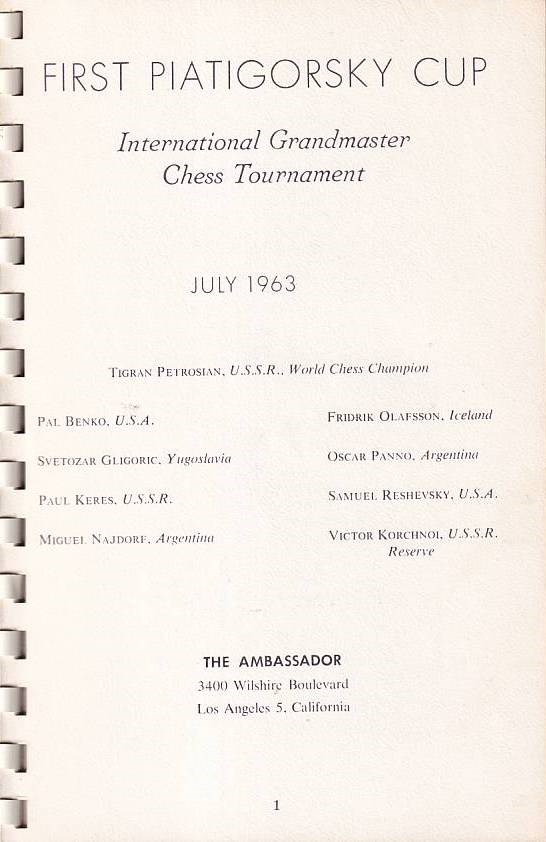 Piatigorsky Cup - 1963. Program from the chess tournament, signed by Kashdan, Petrosian, Benko, Gligoric, Keres, Najdorf, Olafsson, Panno and Reshevsky. 48 pages. Spiral bound.