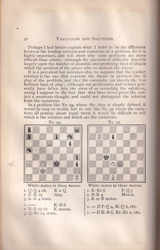 A comprehensive work on problem composition with 534 of the author's problems illustrating the text... .The American problem composer Samuel Loyd (1841-1911) was an "author hardly surpassed in originality, inventiveness, and humor, who also made a name for himself through riddle sketches, puzzles, and the like... his problems have lost none of their freshness and peculiar charm to this day" (Lindörfer p. 161).