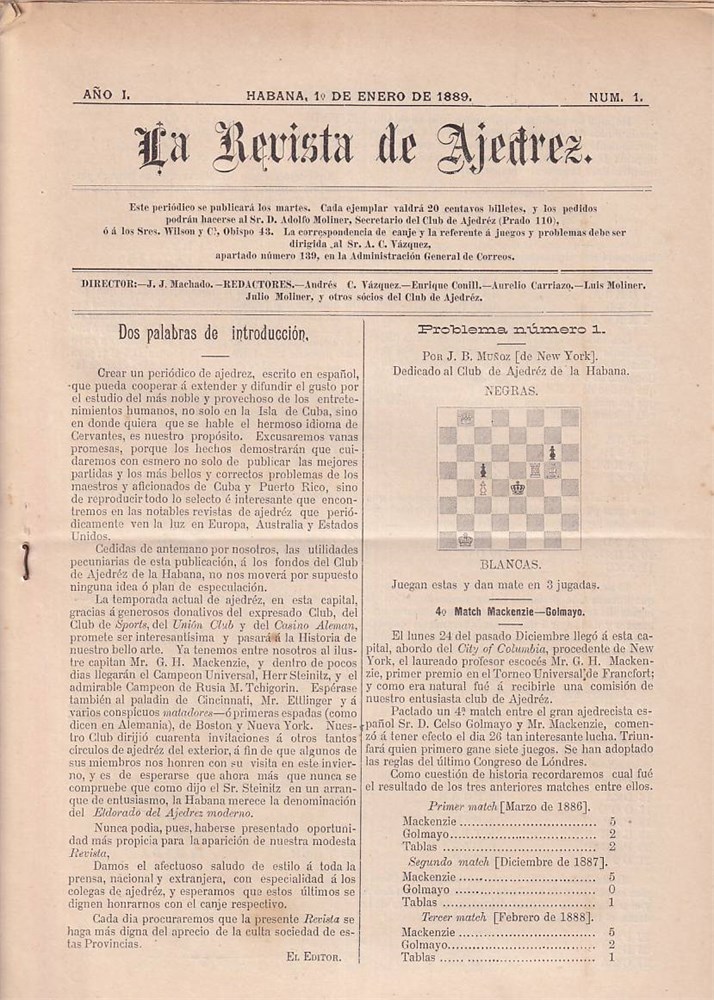 La Revista de Ajedrez was a short-lived chess magazine published in Havana, Cuba in 1889. It was closely connected to the chess scene in the city, particularly surrounding the World Championship match between Wilhelm Steinitz and Mikhail Chigorin held that year. The publication was likely weekly and existed only for a brief period, making it a rare historical source for early Latin American chess.