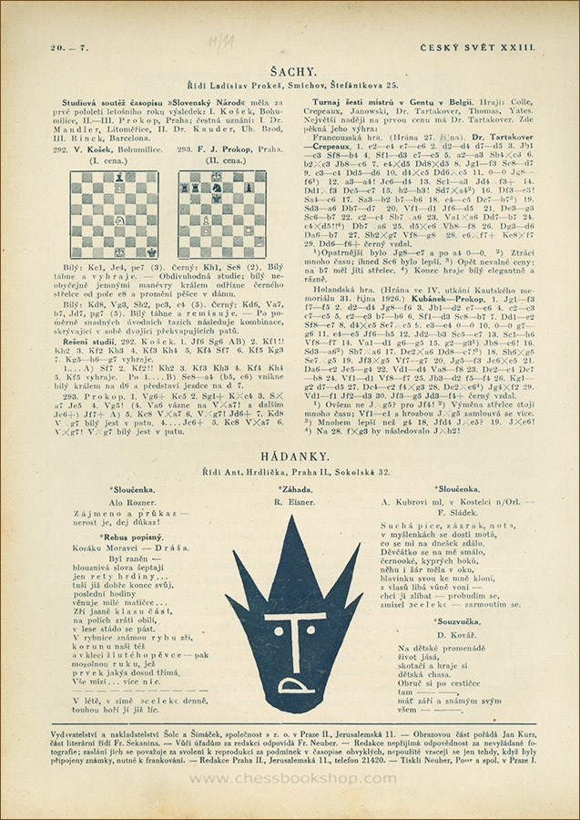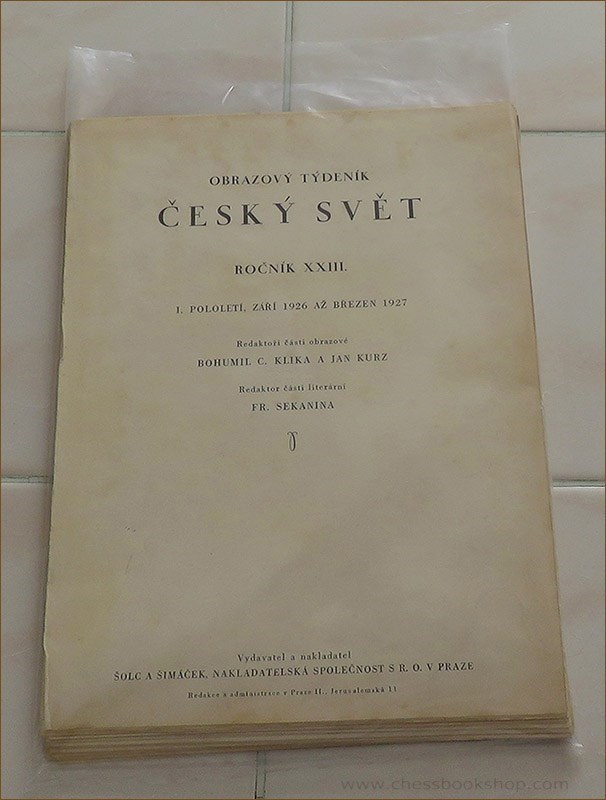 Praha, 1926/27. Free sheets disbound from the magazines. Enclosed: 2 title pages of the magazine (for the 1st and 2nd half) + (all) 5 leaves containing chess photos published outside chess column. Editor master Ladislav Prokes. Size ca 30 x 22 cm. The weight 380 grams. Whyld: Chess Columns page 72; Mokry 284. In Czech.