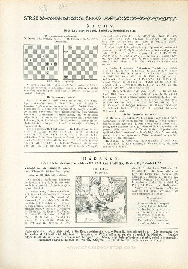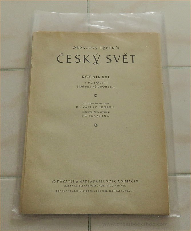 Praha, 1924/25. Free sheets disbound from the magazines. Enclosed: 2 title pages of the magazine (for the 1st and 2nd half). Editor master Ladislav Prokes. Size ca 30 x 22 cm. The weight 360 grams. Whyld: Chess Columns page 72; Mokry 284. In Czech.