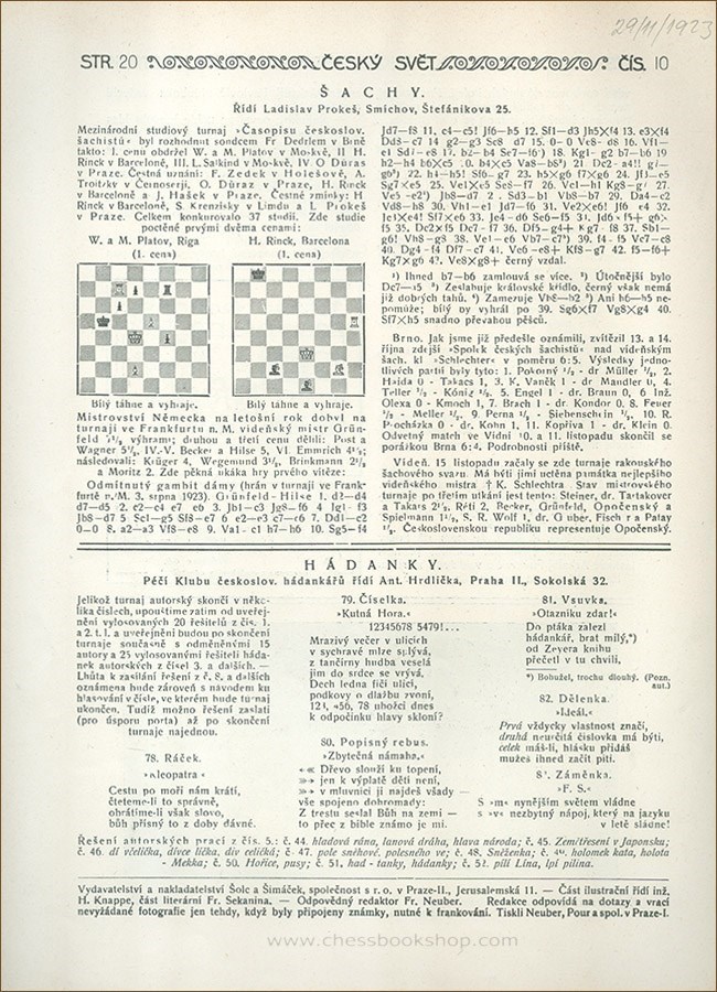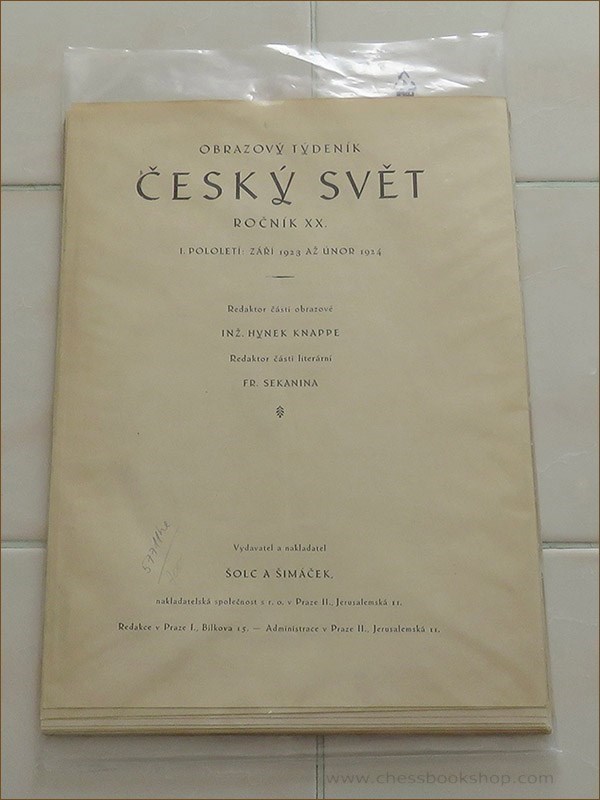 Praha, 1923/24. Free sheets disbound from the magazines. Enclosed: 2 title pages of the magazine (for the 1st and 2nd half). Editor master Ladislav Prokes. Size ca 30 x 22 cm. The weight 320 grams. Whyld: Chess Columns page 72; Mokry 284. In Czech.