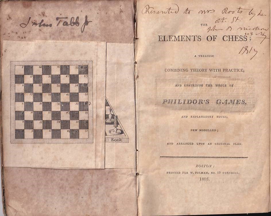 Philidor, A.D. The Elements of Chess; a treatise combining theory with practice, and comprising the whole of Philidor's games, and explanatory notes, new modelled; and arranged upon an original plan. Boston: printed for W. Pelham, No. 59. Cornhill. 1805. Frontis., 208 pages. L/N 608; van der Linde I, 408. With clamshell box. In original boards. L/N 608; van der Linde I, 408.