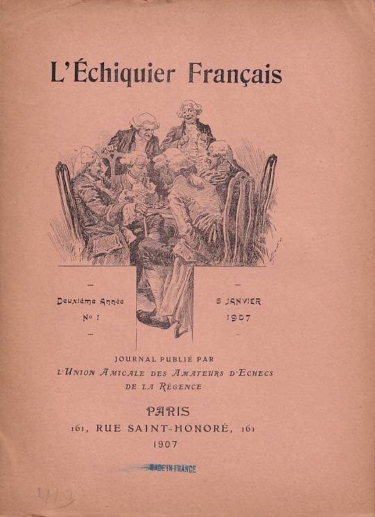 L’Echiquier Français. Journal publié par L’Union Amicale des Amateurs d’Echecs de la Régence. 43 issues. Paris 1906–1909. With many diagrams. Pamphlets. L/N 6028. Di Felice 859. Available are: 1st year 1906 (Nos. 1–12), 2nd year 1907 (Nos. 1–12), 3rd year 1908 (Nos. 1–10) and 4th year 1909 (Nos. 1–9).