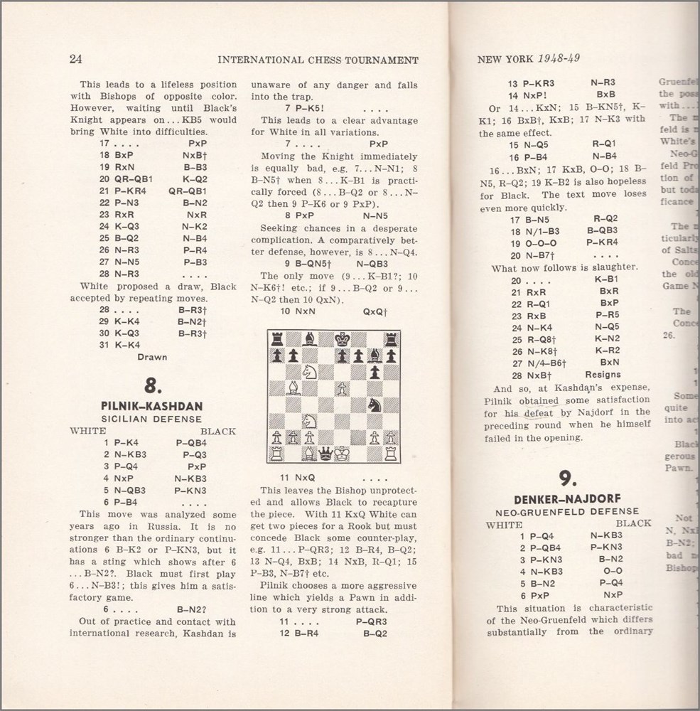 New York 1948 - 1949. The Book of the International Chess Tournament held at the Manhattan Chess Club New York 1948 - 49. All 45 games with detailed annotations in English. Descriptive notation. Many diagrams. A few photos in text. Cross Table. Game index. Progress table. Round-by-round reports. Table of content. Opening summary. Fine won in front of Najdorf. VI, 130 pages. Publishers original red cloth. "Tournament Book Series", Volume I. New York, Albert S. Pinkus 1950. L/N 5765. Betts 25 - 189.